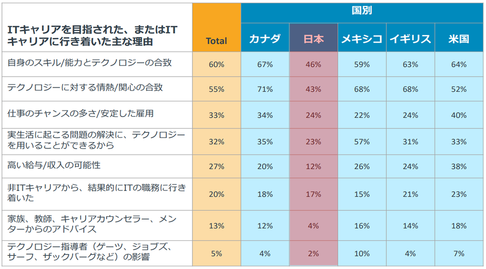 そして、これら全体の結果から、日本国内のITプロフェッショナルの仕事の満足度は、世界的にみて低いことがうかがえます。