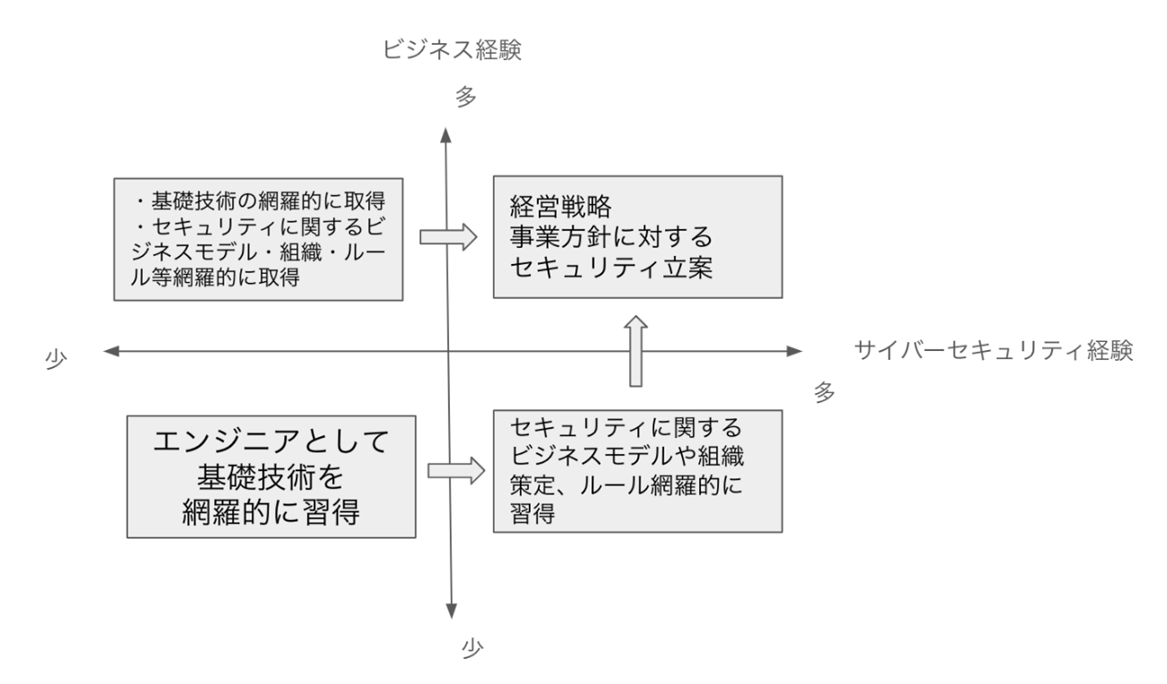 スキルアップの順番については、「サイバーセキュリティ経験」と「ビジネス経験」の4象限に分類すると説明がつきやすいので、下図を参照にしながらスキルレベルを確認していきます。セキュリティエンジニアとして、現場でサイバーセキュリティに関するテクニカルスキルを網羅的に習得した上で、それらエンジニアを統括するマネジメントを行う、というステップが望ましいでしょう。